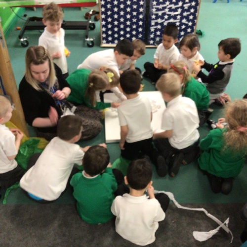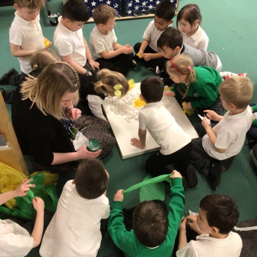 In Reception, the children collaged their class flowers. We worked collaboratively to use a range of media. The children made different shapes to put onto the collage and also described a range of textures.