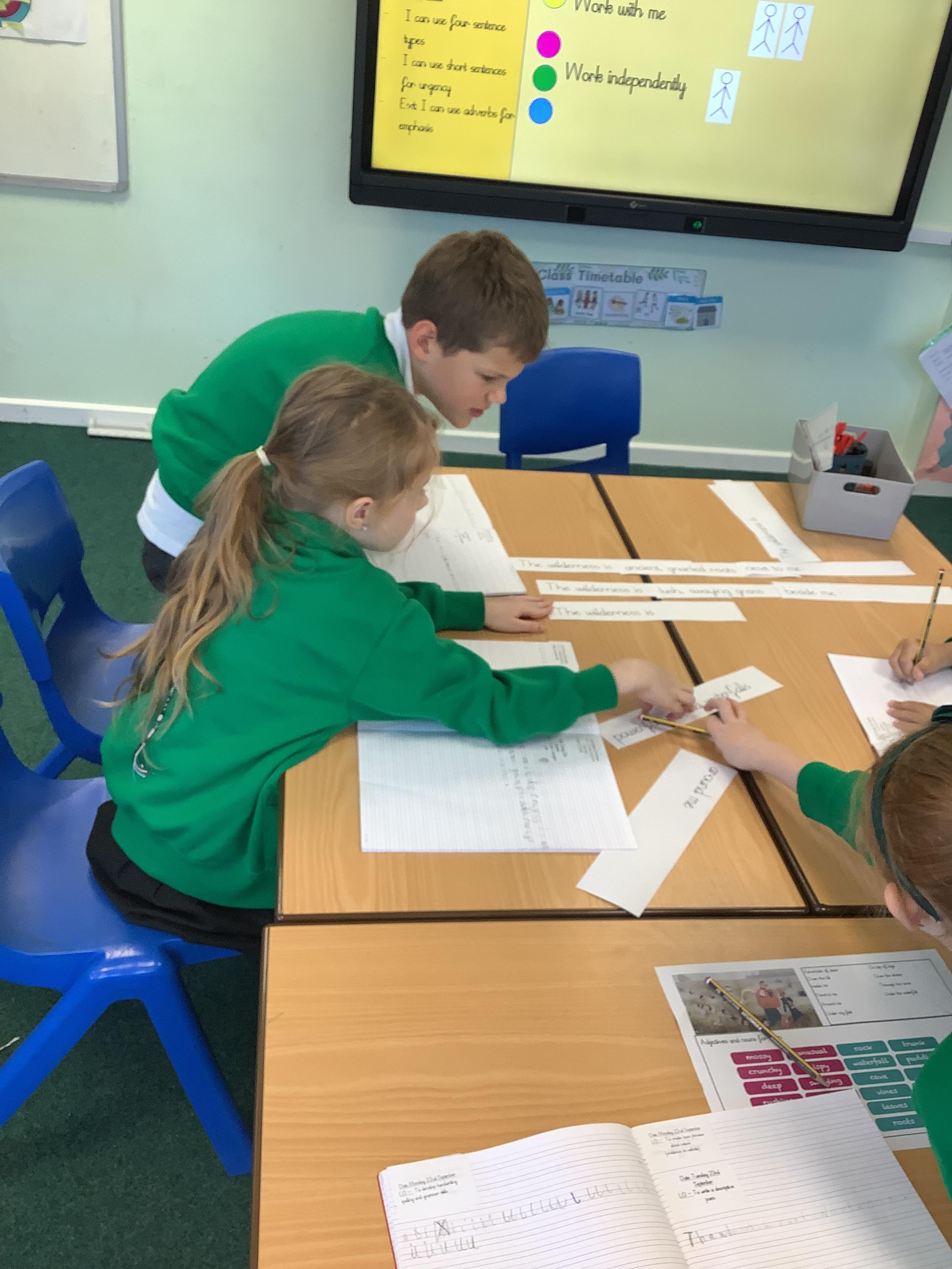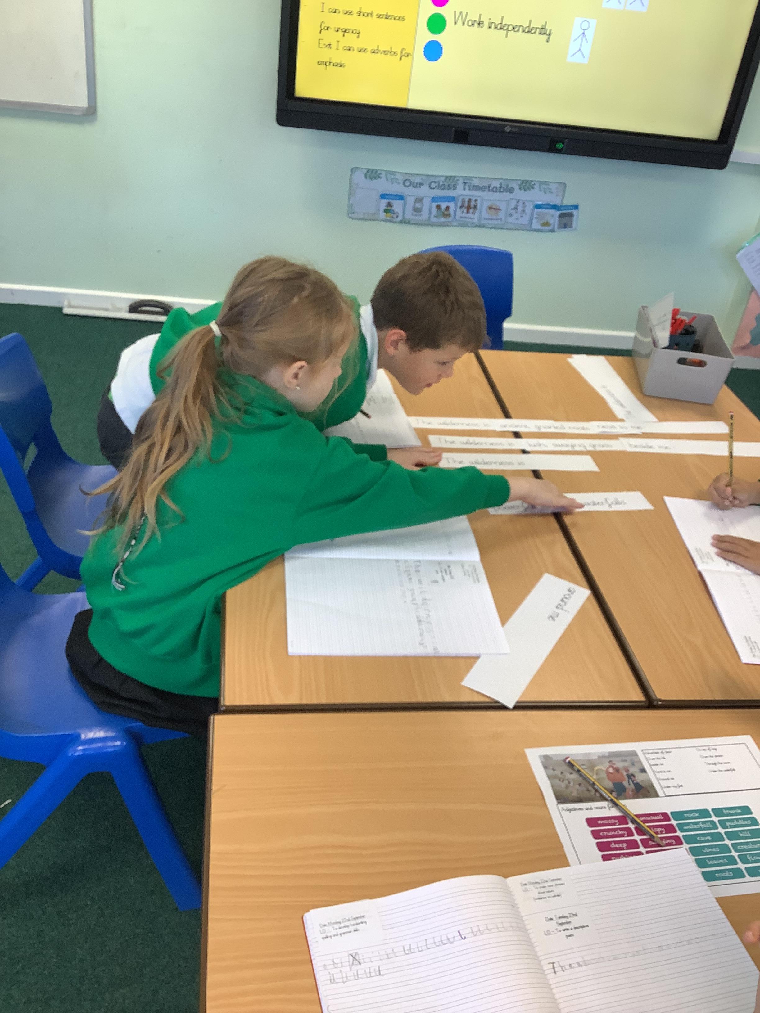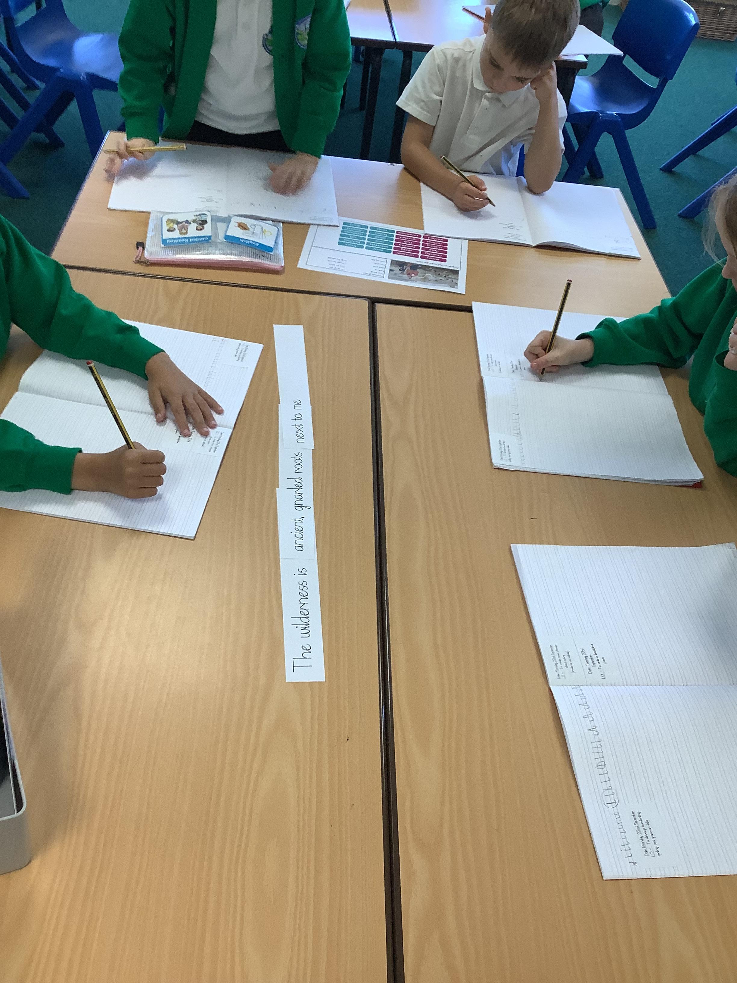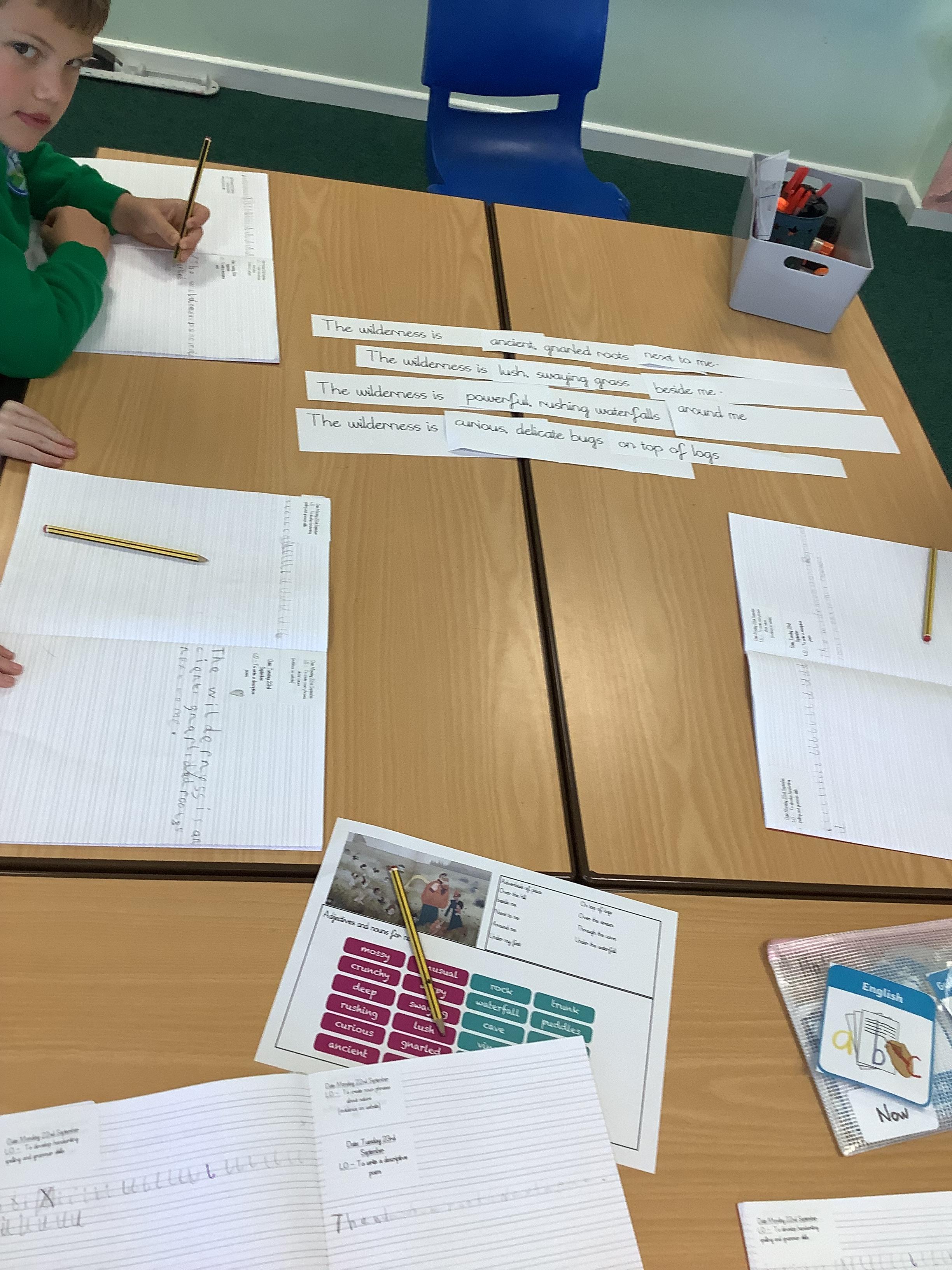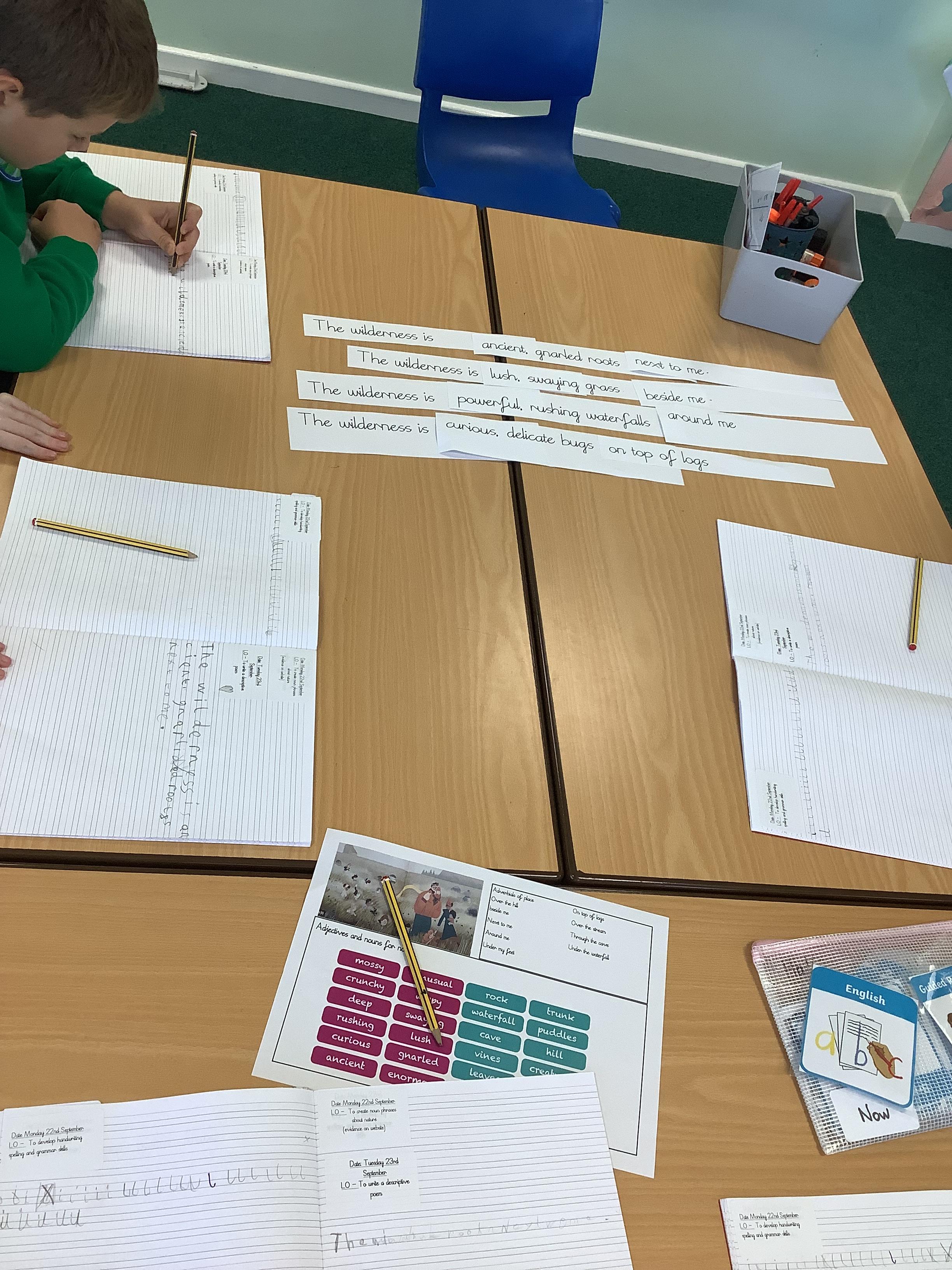 Today we used repeated structures, noun phrases and adverbials of place to create a poem. We used our bank of noun phrases we created after our nature walk to describe the wilderness.