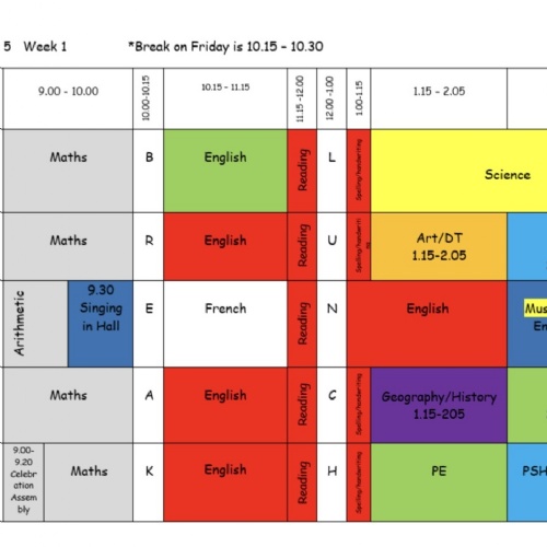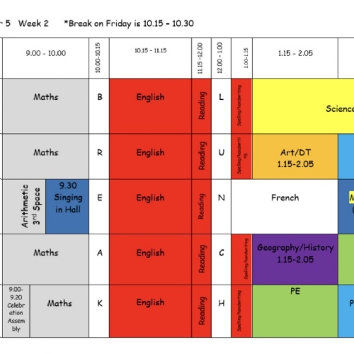 This is the timetable for Year 5. As you can see, we have a Week A and Week B timetable. Our P.E. days are Thursday and Friday. Please ensure your child always has their P.E. kit in school and that all items are clearly labelled with their name. Children need black shorts, a white t-shirt, jogging bottoms, pumps, and old trainers for outside lessons. We recommend that they bring in a kit every half term and leave it in school for the duration of the half term. Please can you ensure earrings are removed on P.E days.